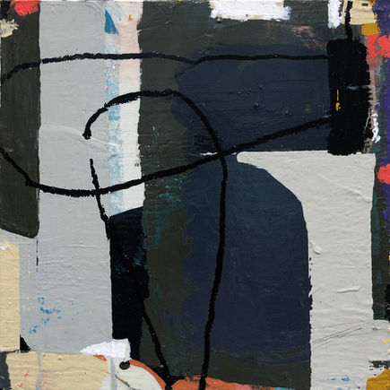 Gordon Studer’s earthy, confident abstracts are rooted in his discipline as an award-winning commercial illustrator, lending his work a strong, graphic cadence. The result speaks to liminal experience, interstitial time, and dreamscapes in deliberate forms in black atop a palette of ochre, sky blue, and crushed clays.